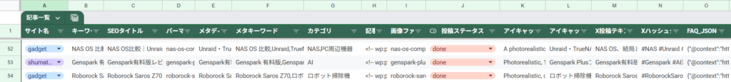 生成されたHTMLはGoogleスプレッドシートに転記し、Make(旧Integromat)でWordPressに下書き投稿しています。タイトル、本文、スラッグ、カテゴリーなどを1行にまとめておけば、ボタンひとつで下書きが作成される仕組みです。