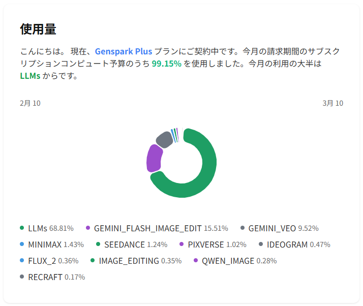 筆者が契約した2026年2月時点では、Plusプランは月額$24.99(年払い$19.99/月、日本円で約3,000〜4,000円)でした。ただし2026年3月にPlusプランの料金改定($49.99/月、クレジット21,000/月)が報告されています。Proプランは月額$249.99(年払い$199.99/月)です。料金体系は変動するため、最新情報はGenspark公式料金ページで確認してください。