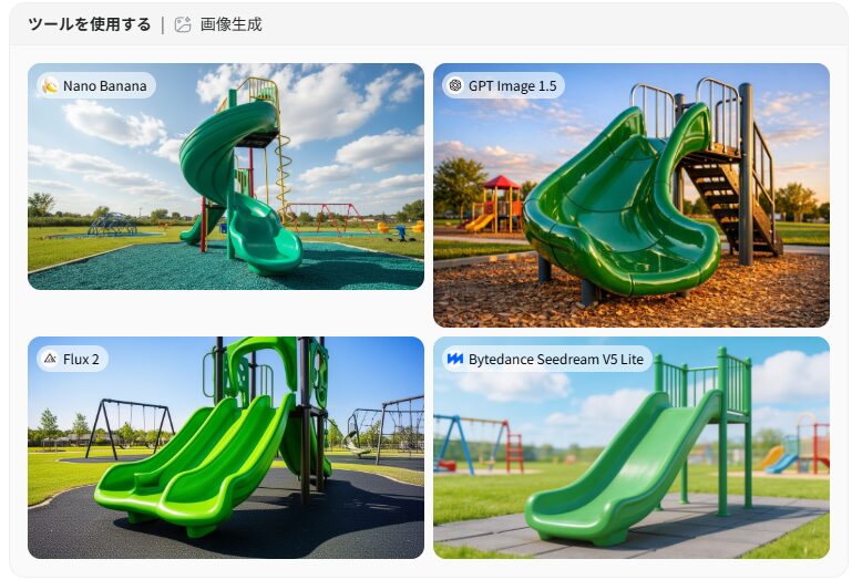 ちなみにプライベートでは2歳の子どもに「何が見たい?」と聞いて画像を作ってみました。「緑の滑り台!」というリクエストで生成したところ、本人のリアクションは「ふーん」程度。AIの画像生成は子どもの反応を予測するほうが難しいようです。