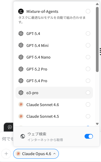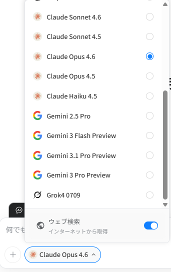 筆者が特に重宝しているのは、モデルの切り替えが1クリックでできる点です。「この質問はClaudeのほうが的確に答えるな」と感じたらすぐに切り替えて再質問できます。複数のAIサービスを個別に契約する必要がなくなりました。