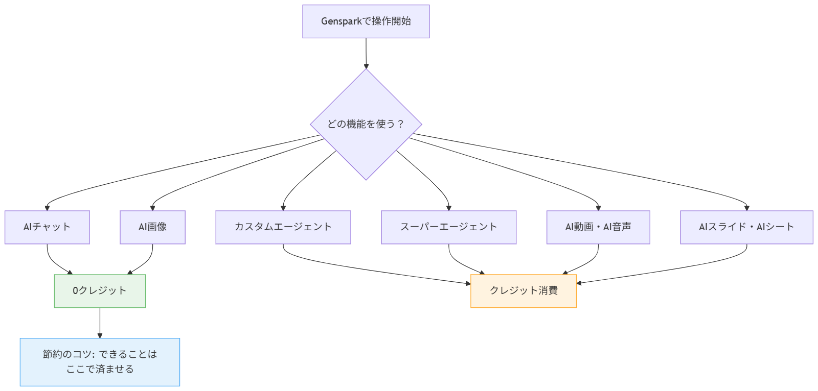 ここが重要なポイントです。Gensparkのクレジット消費ルールには明確な「ゼロ消費ゾーン」があります。Genspark公式クレジットガイドに記載されている通り、「AIチャット」と「AI画像」からの利用はクレジット消費ゼロです。