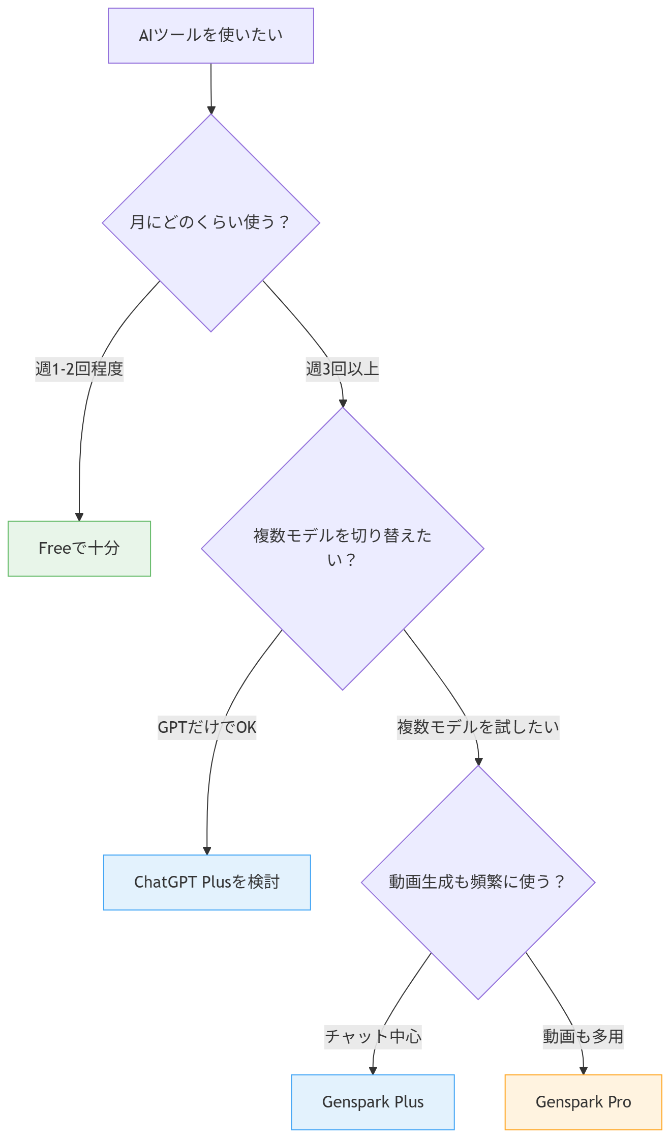 A["AIツールを使いたい"] --> B{"月にどのくらい使う?"}