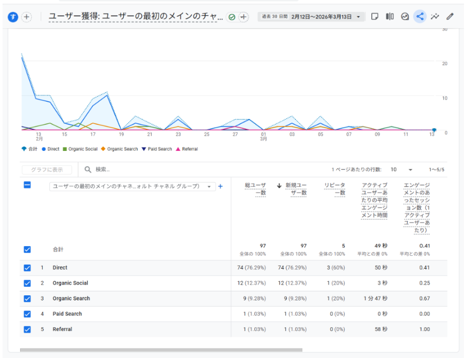 Organic Search(検索流入)は9%の9ユーザーです。開設1ヶ月のサイトがGoogleにインデックスされるまでには時間がかかります。Google検索の仕組みに関する公式ドキュメントでも、新しいページがクロール・インデックスされるまでにはタイムラグがあると説明されています。9ユーザーでも検索から来ている事実があるだけ上出来です。